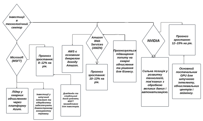 1. В технологічному секторі, який стабільно лишається одним із найдинамічніших на ринку та має величезний потенціал для інвестицій у 2025 році, на увагу заслуговують компанії, що працюють в галузях ШІ, напівавтоматизації, хмарних обчислень та електронної комерції. Першочергово основними драйверами ринкового зростання продовжують бути: