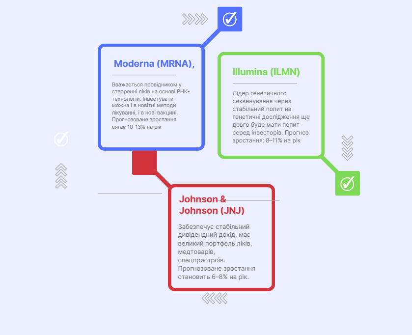 - лідер генетичного секвенування Illumina (ILMN). Через стабільний попит на генетичні дослідження ще довго буде мати попит серед інвесторів. Прогноз зростання: 8−11% на рік;