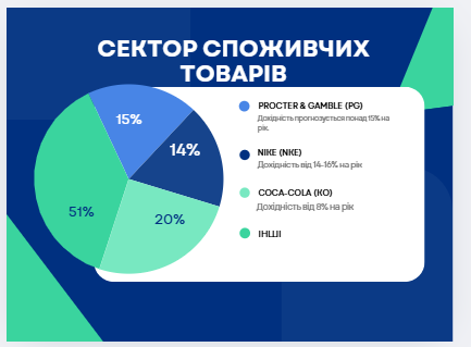 - Procter & Gamble (PG). Компанія, що є світовим лідером в плані виробництва споживчих товарів, зокрема в категоріях гігієни та побутової хімії, активно розвиває стратегії сталого розвитку, орієнтуючись водночас на екопродукти, що відповідають оновленим потребам споживачів. Дохідність прогнозується понад 15% на рік.