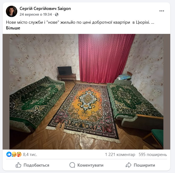 «Нове місто служби й „нове“ житло за ціною добротної квартири в Цюриху. Поговорив з місцевими, не військовими, які теж знімають. Ціна, як правило, вполовину менше. Цих квартир немає в обʼявах, бо передаються „з рук в руки“ і не для вояк», — каже військовий.