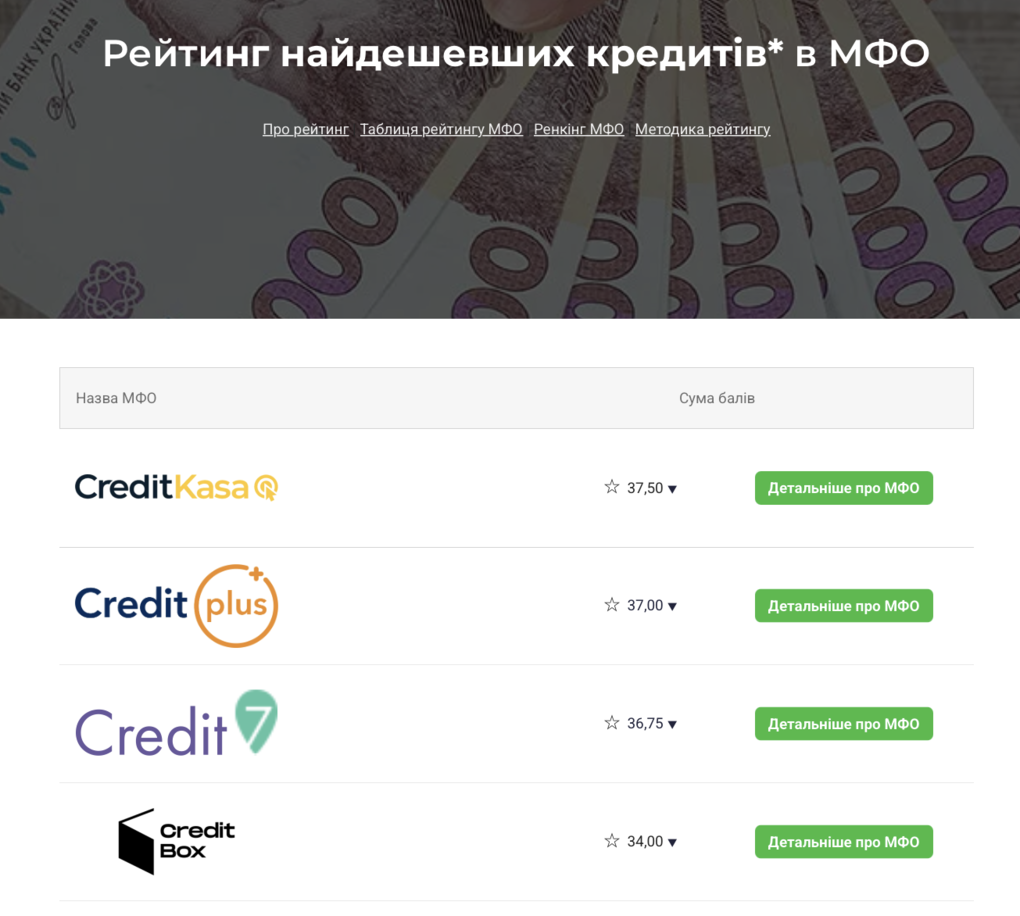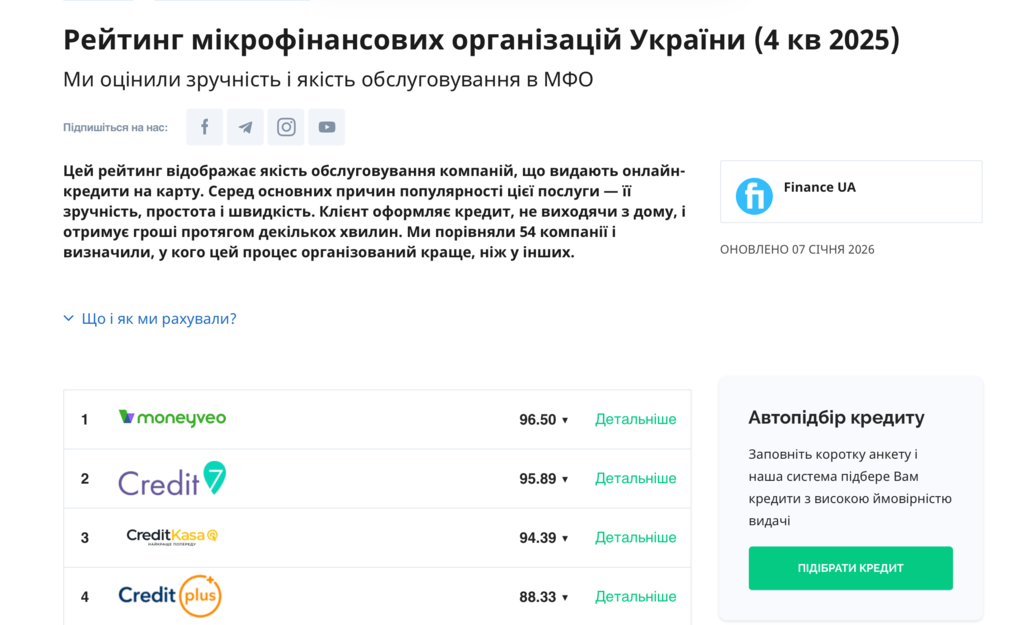 Водночас finance.ua аналізує якість обслуговування: наскільки легко знайти інформацію на сайті, як працює підтримка, чи доступна верифікація через BankID, чи зручно погашати позику, чи є програми лояльності та повноцінний мобільний застосунок. Тут у центрі уваги — клієнтський досвід. Якщо компанія стабільно в лідерах обох рейтингів, це означає, що вона поєднує конкурентні умови та якісний сервіс.