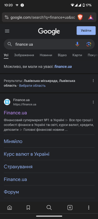 Інтерфейс Brave Browser. Скриншот пошукової сторінки Google
