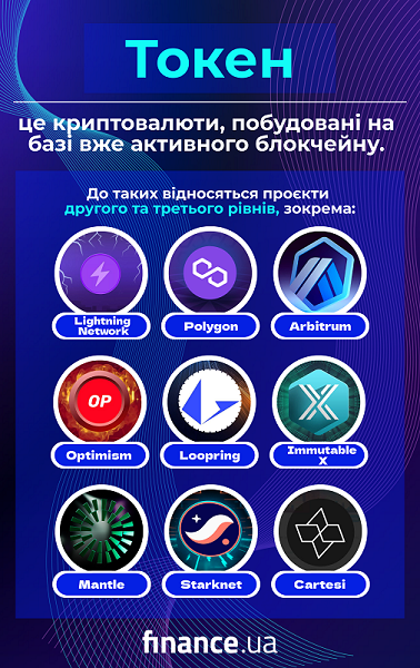 Токени не мають власного блокчейну, проте вони можуть виконувати функції аналогічні монетам в межах своєї екосистеми.