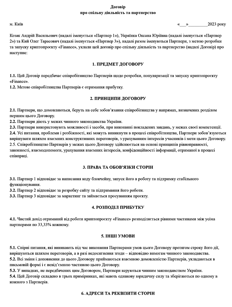 Не забудьте скласти договір про розподіл прибутків ще до того як вони з’являться. Чіткість відносин між партнерами дозволяє створити міцний колектив, який подолає будь-які виклики. Це ж саме стосується обов’язків, виразний розподіл яких дозволить уникнути конфліктів та покращить ефективність роботи.