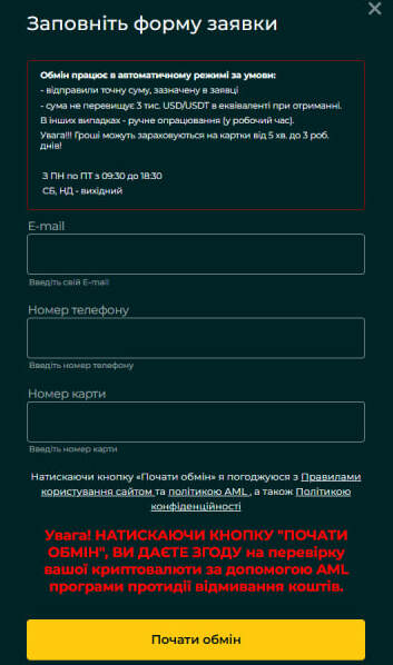 Після цього необхідно перевести криптовалюту на адресу обмінника та дочекатися оплати заявки. Час зарахування коштів на картку — від 15 хвилин до 3 робочих днів.