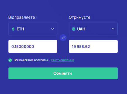 - Вводиться сума для обміну та перевіряється актуальний курс. Сервіс одразу відображає можливу комісії, кінцевий результат і час зарахування.