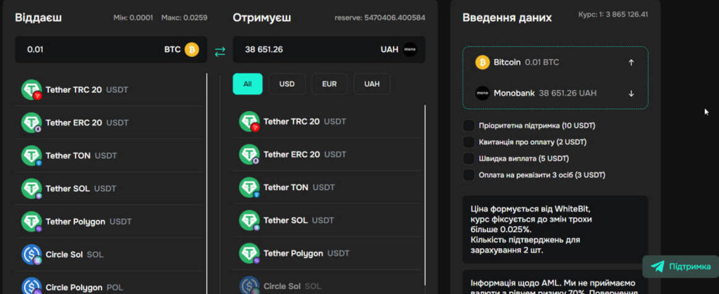 Варіантів обміну криптовалюти на гривню є достатньо. Але уважно перевіряйте номер картки. Також під час переведення криптовалюти на гаманець обмінника переконайтеся, що обрано правильну мережу. Вона завжди вказується у формі заявки на сайті сервісу.