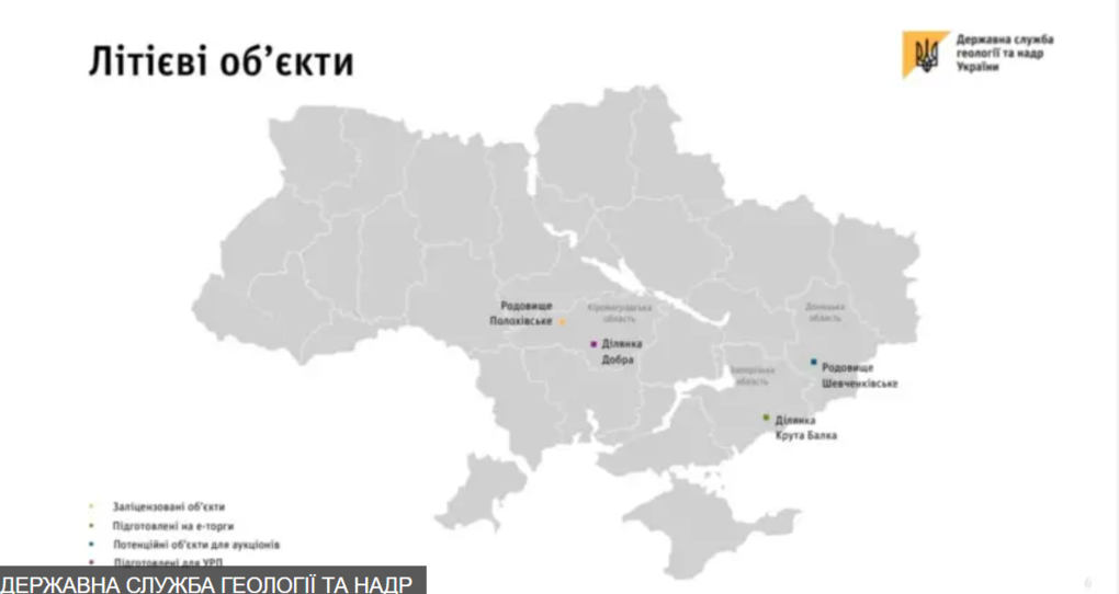 росія окупувала щонайменше два родовища літію: Шевченківське Донецької області та родовище комплексних руд Крута Балка в районі Бердянська. Під контролем України лишаються поклади літію на Кіровоградщині.