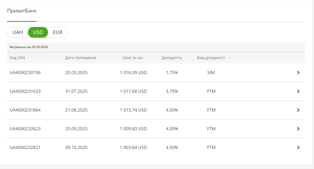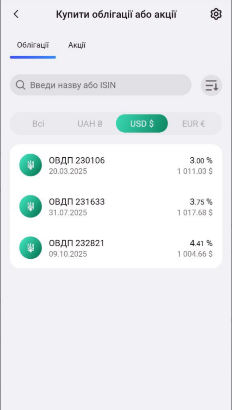 Зокрема, купити ОВДП у доларах можна в ПриватБанку, використовуючи банківський застосунок «Приват24»: