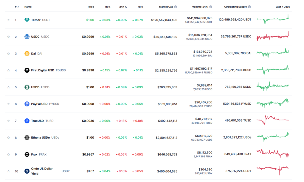 Перша десятка найбільших за капіталізацією стейблкоїнів. Джерело: Coinmarketcap