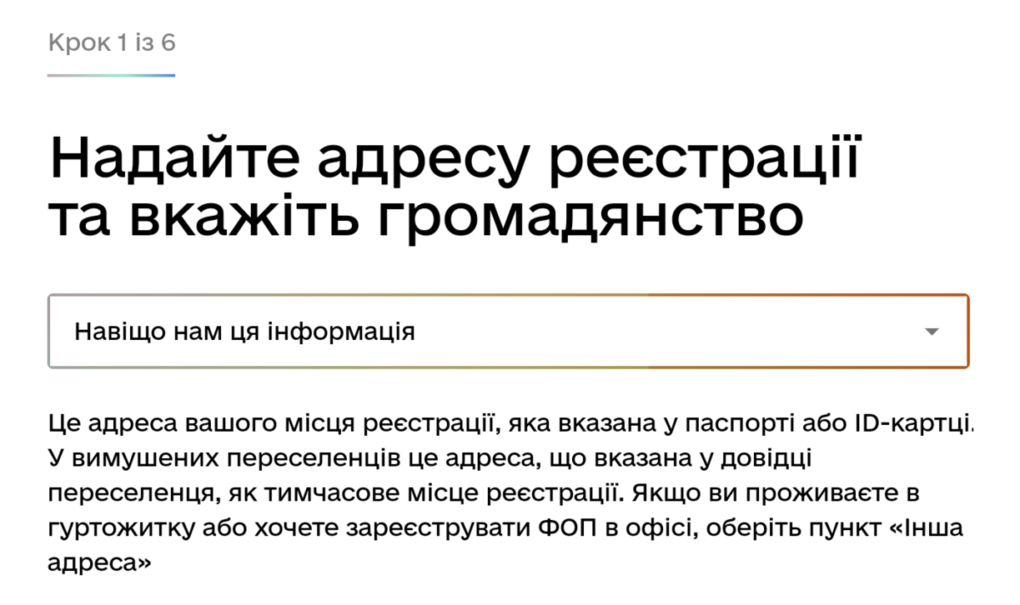 Крок 1. Потрібно вказати адресу своєї реєстрації, якщо вона не підтягнулася автоматично.
