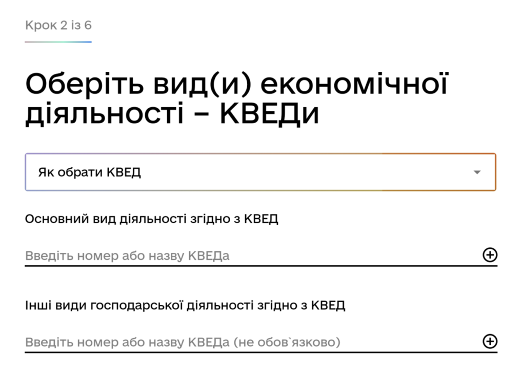 Крок 2. Зазначити один або декілька КВЕДів. КВЕД або ж класифікатор видів економічної діяльності – це код, який містить усі можливі напрямки роботи підприємств. ФОП має право займатися бізнесом тільки за тими кодами, які записані в його реєстраційних документах. Повний перелік – за посиланням.