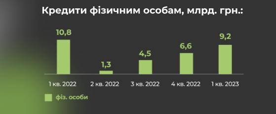 В першому кварталі 2022 року кредити відновились на 60%, у порівнянні з довоєнними показниками. У другому був різкий спад. Люди майже перестали користуватися цією послугою. В першому кварталі 2023 року знову відбулося відновлення.