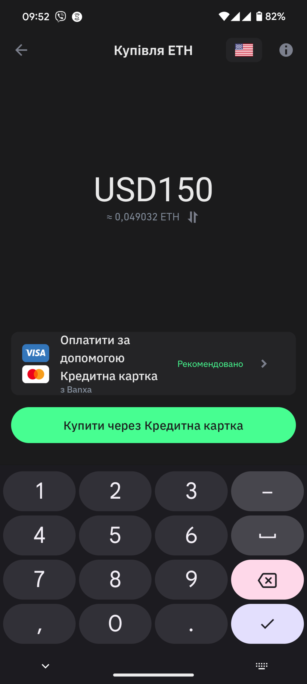 8. Вказуємо суму на яку готові придбати та натискаємо купити за допомогою кредитної картки.
