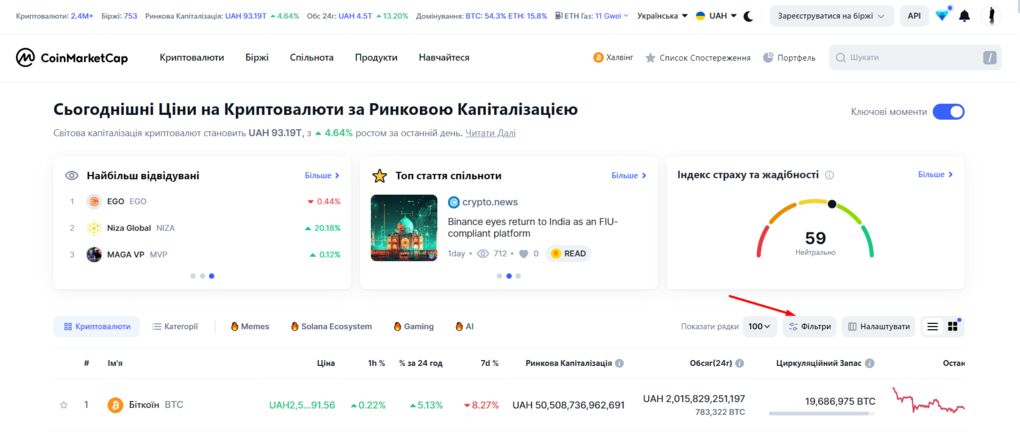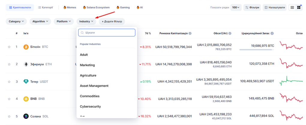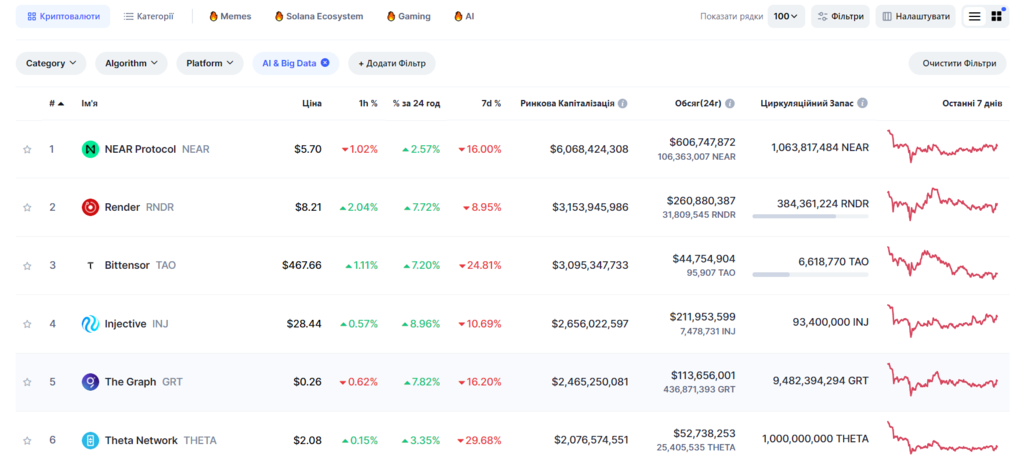 До прикладу зараз на гребні слави штучний інтелект і все що з ним пов’язано. Для того, щоб знайти токени котрі працюють в цьому напрямку переходимо на coinmarketcap та застосовуємо фільтри.