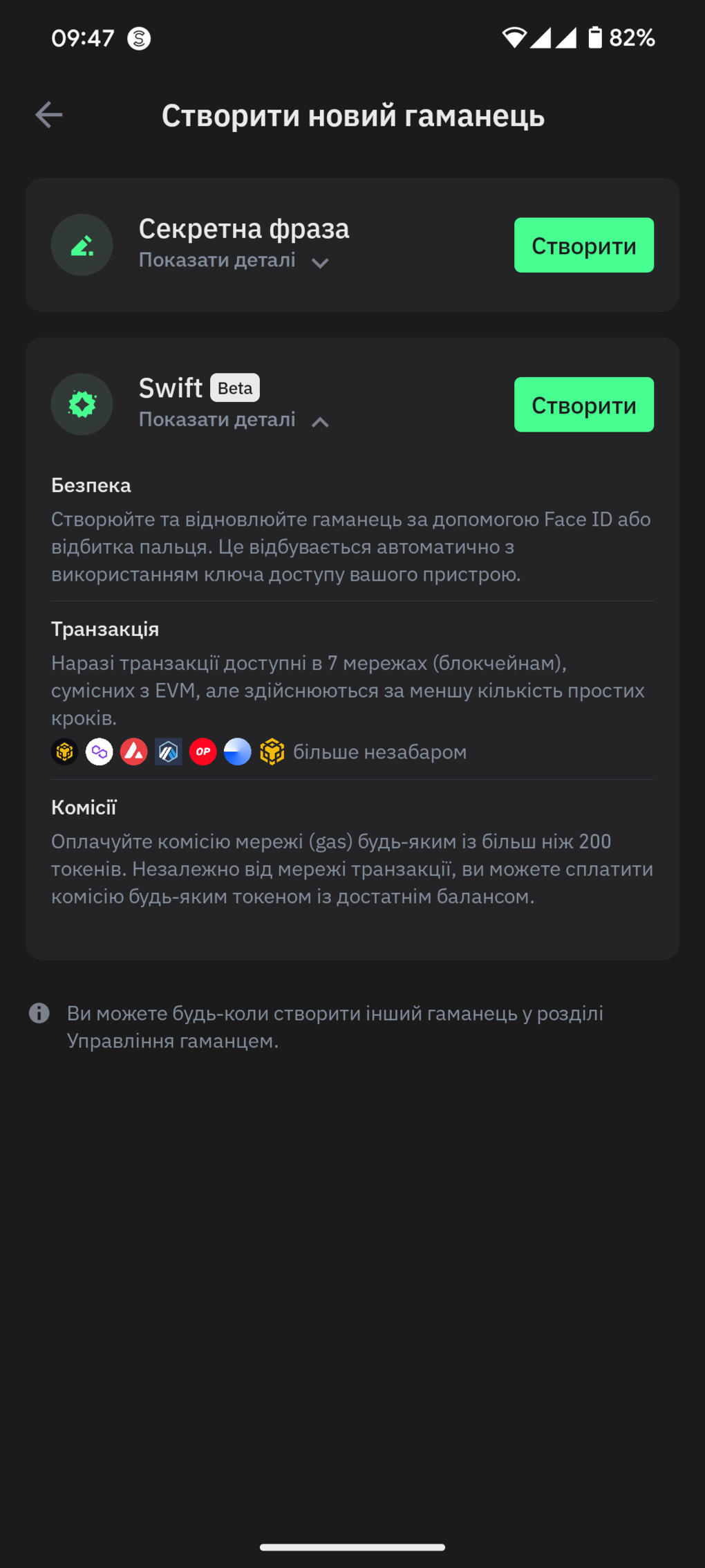 На скріні нижче ми навмисне розгорнули опцію Swift оскільки вона дозволяє створити криптогаманець за допомогою відбитку пальця або розпізнавання обличчя. Це дуже зручно і позбавляє необхідності самостійно зберігати секретну фразу. Проте виникає питання щодо безпеки: що буде якщо пристрій буде втрачено? Де зберігаються ключі?
