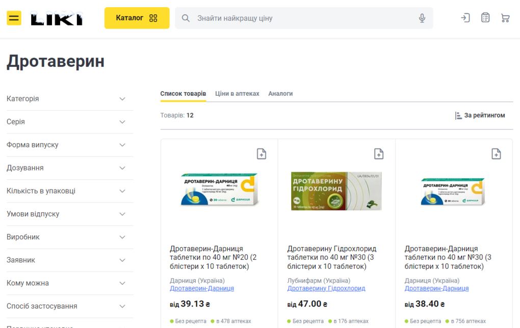 Сервіс Liki.ua має вдосконалену карту, споживач може чітко ідентифікувати, в якій конкретній мережі він резервує ліки, що унеможливлює плутанину. Система фільтрів інтуїтивно зрозуміла, можна вибрати найближчу аптеку, або найдоступнішу за ціною, або те й інше. Ось як приклад: