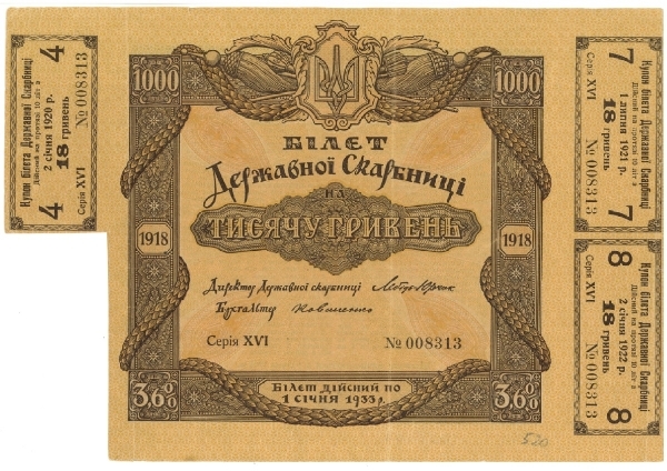 Номінал 1000 гривень мали і білети позики Державної Скарбниці. Це були облігації з дохідністю 3,6%, пізніше їх використовували як сурогат паперових грошей через дефіцит розрахункових грошових одиниць.