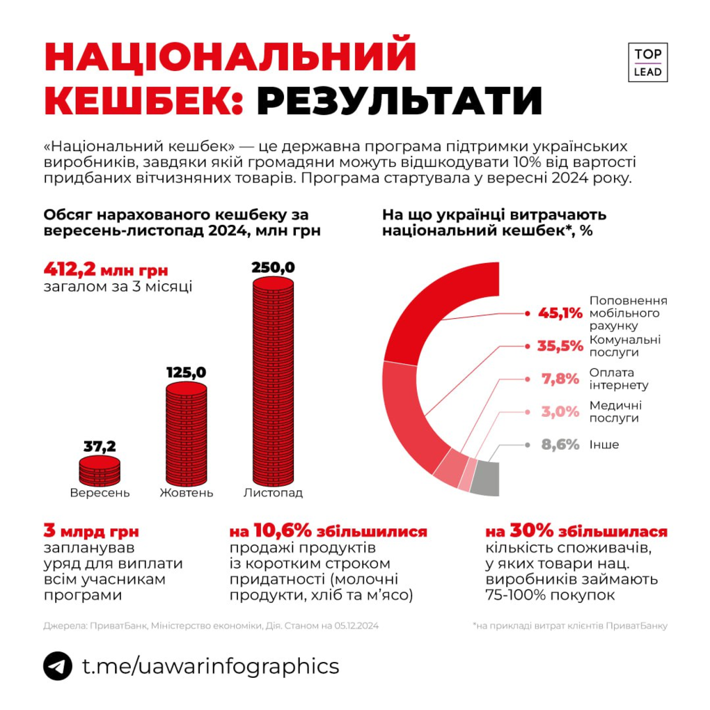 За офіційними відомостями, які зібрали в наведеній нижче інфографіці колеги з UA War Infographics, 412 млн гривень національного кешбеку нарахувала загалом українцям держава. 45% від зазначеної суми громадяни витратили на поповнення мобільного рахунку, трохи більше, ніж 35% сплачено з цих грошей за комунальні послуги.