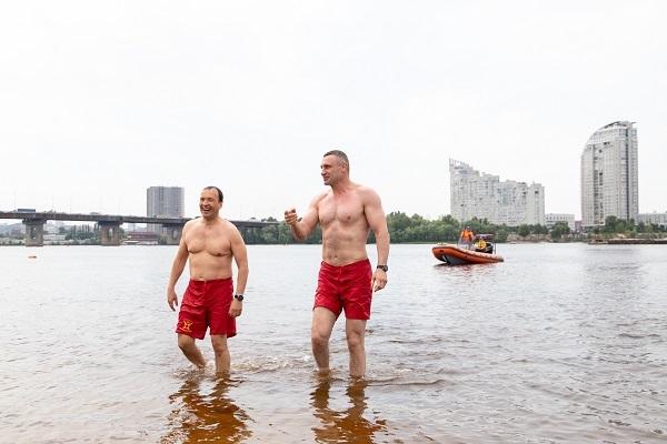 Київський міський голова Віталій Кличко (праворуч) і заступник голови КМДА Петро Пантелеєв (ліворуч) купаються на пляжі «Чорторий». Київ, червень 2021 року. Фото: пресслужба КМДА
