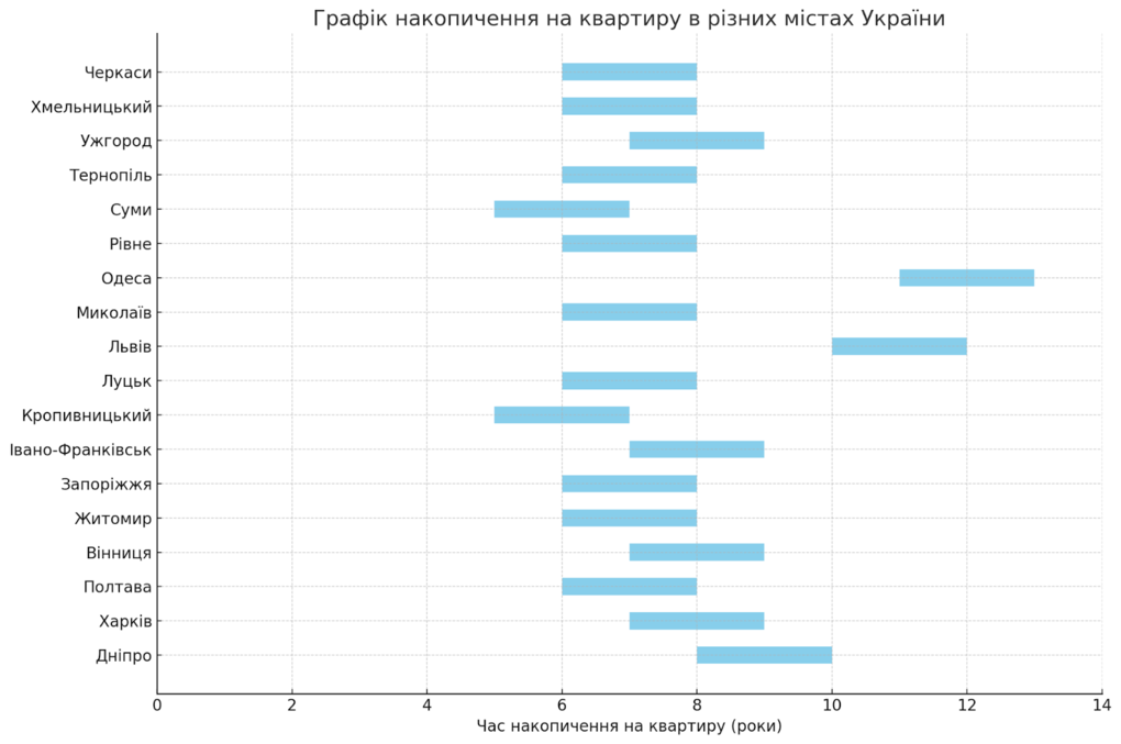 Цей приблизний графік накопичення на квартиру в різних містах України показує діапазони часу для кожного міста. Завдяки такому типу візуалізації виходить з легкістю порівнювати період для здійснення накопичення в кожному з наведених для прикладу міст.