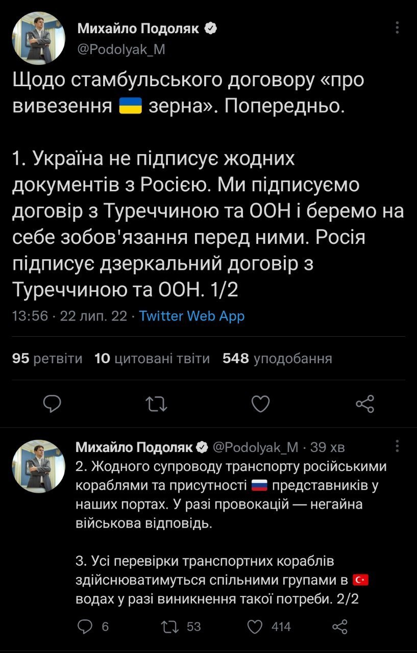 Коментар радника Офісу Президента Михайла Подоляка щодо зернової угоди напередодні її підписання. Джерело: Twitter