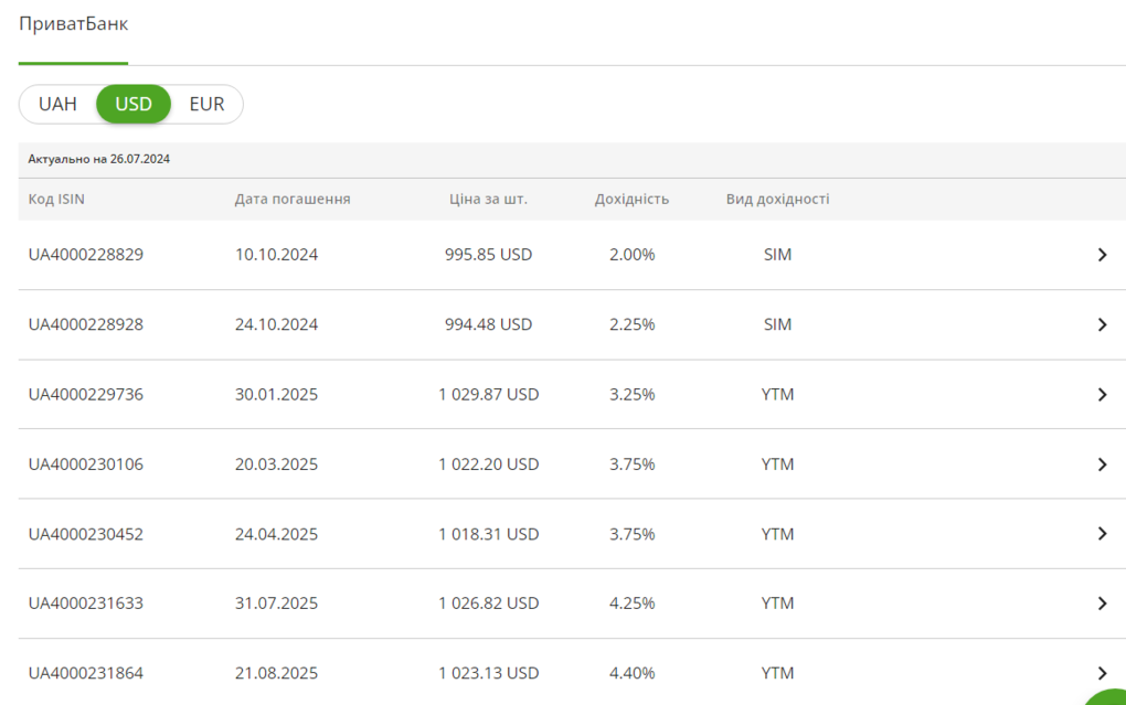 Зверніть увагу: облігації і в доларах США, і в євро продаються дорожче від номіналу. Причина — з них будуть купонні виплати (відсотки).
